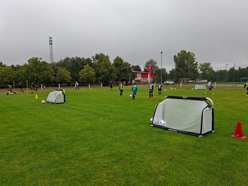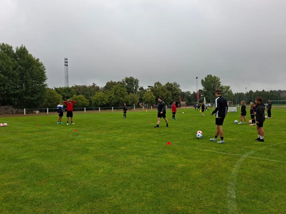 Nach einer kurzen Begrüßung und Vorstellung begann der erste Camptag am Montag mit spannenden Übungen. Der Fokus lag am Vormittag vor allem auf Torschuss-Training sowie Übungen zur Zweikampfführung. Zwischen den Einheiten konnten die Kinder bei einer kleinen Riegelpause neue Energie tanken. Zum Mittagessen stärkten sich alle mit Kartoffeln, Gemüse und Schnitzel, bevor es am Nachmittag mit einem besonderen Highlight weiterging: „Deutschen Meisterschaft in Hohenleipisch"